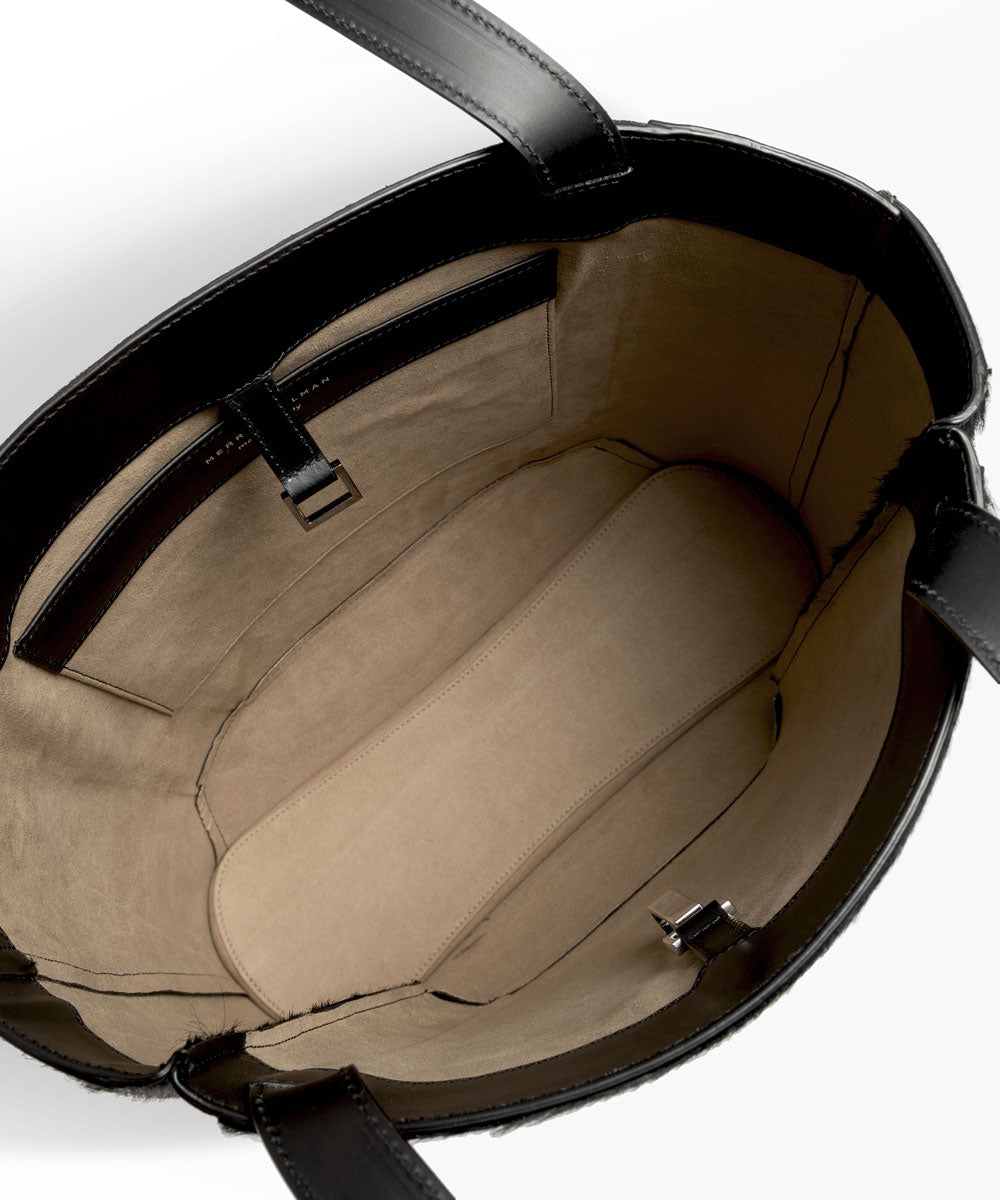 A sophisticated multi-use carryall. Generous in size with curves set off by architectural adornments. Features one spacious compartment with an inside slip pocket for small essentials. Can be carried by hand or over the shoulder.